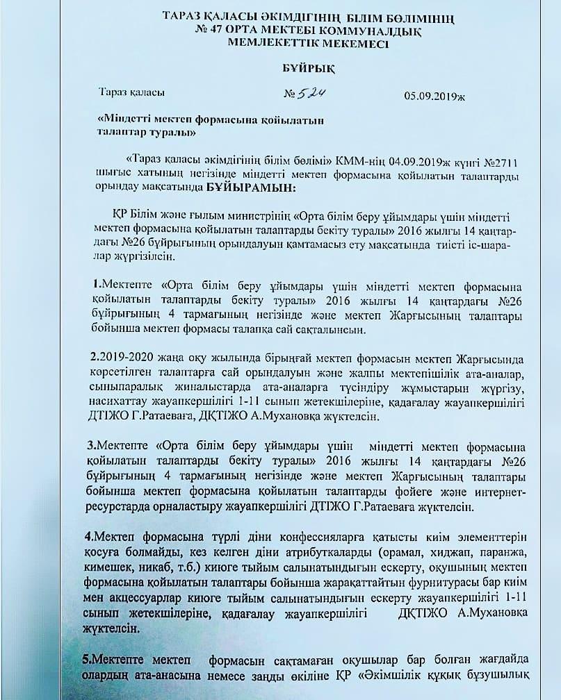 Міндетті мектеп формасына қойылатын талаптар туралы бұйрық.
