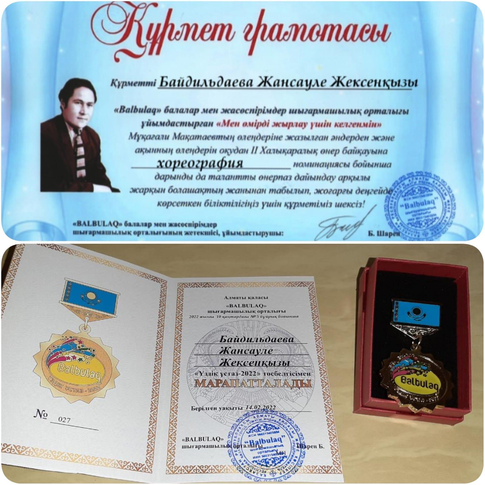 2022 жылы,28 ақпан күні "Мен өмірді жырлау үшін келгенмін" атты Мұқағали Мақатаевтың өлеңдеріне жазылған әндерден және ақынның өлеңдерін оқудан Алматы қаласында ұйымдастырылған ІІ Халықаралық өнер байқауына 47 мектептің "Айналайын" би үйірмесінің жетекшісі Ж.Байділдаева дарынды да, талантты жас өнерпаздарды дайындап, жоғары деңгейде көрсеткен біліктілігі үшін" Құрмет грамотасымен" және "Үздік ұстаз- 2022" төсбелгісімен марапатталды.