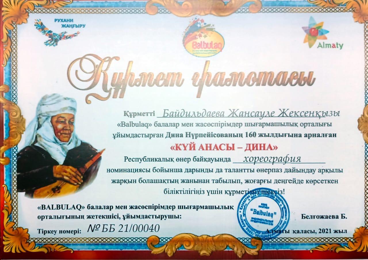 2021 жылдың 20-23 қазан аралығында 47 орта мектебінің "Айналайын" би үйірмесінің жетекшісі Ж.Байділдаева Алматы қаласында Дина Нүрпейісованың 160 жылдығына орай өткен "Күй анасы-Дина" атты Республикалық өнер байқауында хореография номинациясы бойынша дарынды да талантты өнерпаз дайындағаны үшін Құрмет грамотасымен марапатталды.