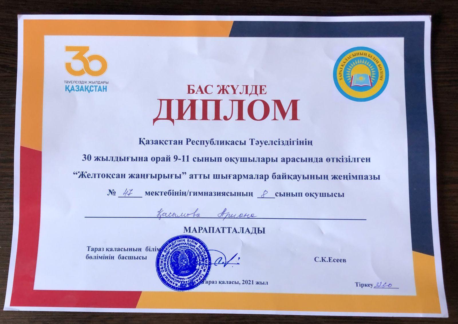 Қалалық білім бөлімінің ұйымдастыруымен 2021жылы желтоқсан айының 15 күні Қазақстан Республикасы Тәуелсіздігінің 30 жылдығына орай оқушылардың шығармашылық қабілетін арттыру, патриоттық сезімін ояту, тәуелсіз елге деген құрметін күшейту мақсатында "Желтоқсан жаңғырығы" тақырыбында шығармалар байқауы өткізілді. Байқау қорытындысы бойынша 47 орта мектебінің 8"А" сынып оқушысы Қасымова Ариана бас жүлдені иеленіп, дипломмен марапатталды. Жетекшісі: Қазақ тілі мен әдебиет пәні мұғалімі - Турысбек М.Ж.