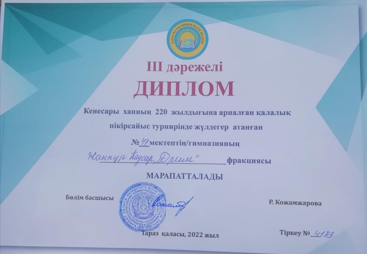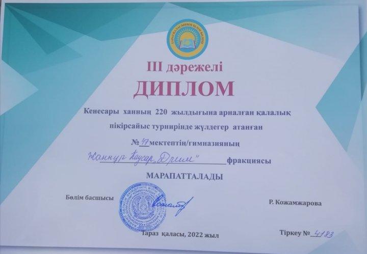 Тараз қаласы білім бөлімінің ұйымдастыруымен өткен Кеңесары ханның 220 жылдығына арналған пікірсайыс турниріне 47 орта мектебінің оқушысы Жаннұр Кәусар қатысып, "Дрим" фракциясы lll дәрежелі дипломмен марапатталды.Мектептегі дебат жетекшісі география пән мұғалімі Мырзахметова Қарлығаш.Жеңістеріңізбен құттықтаймыз!!
