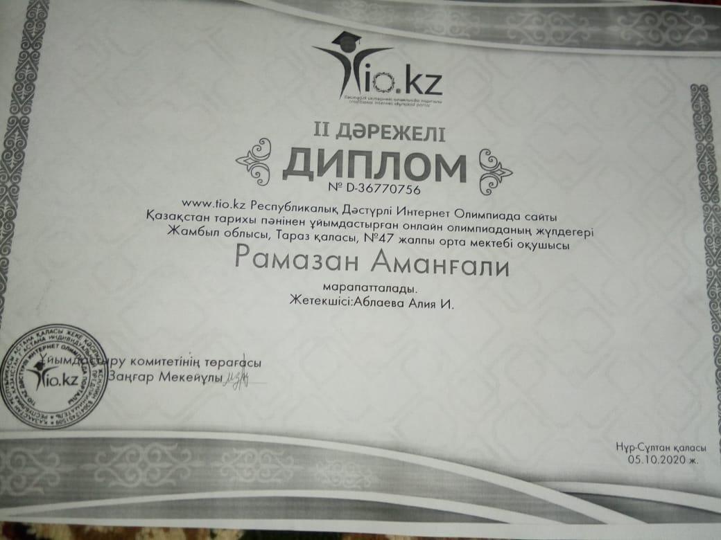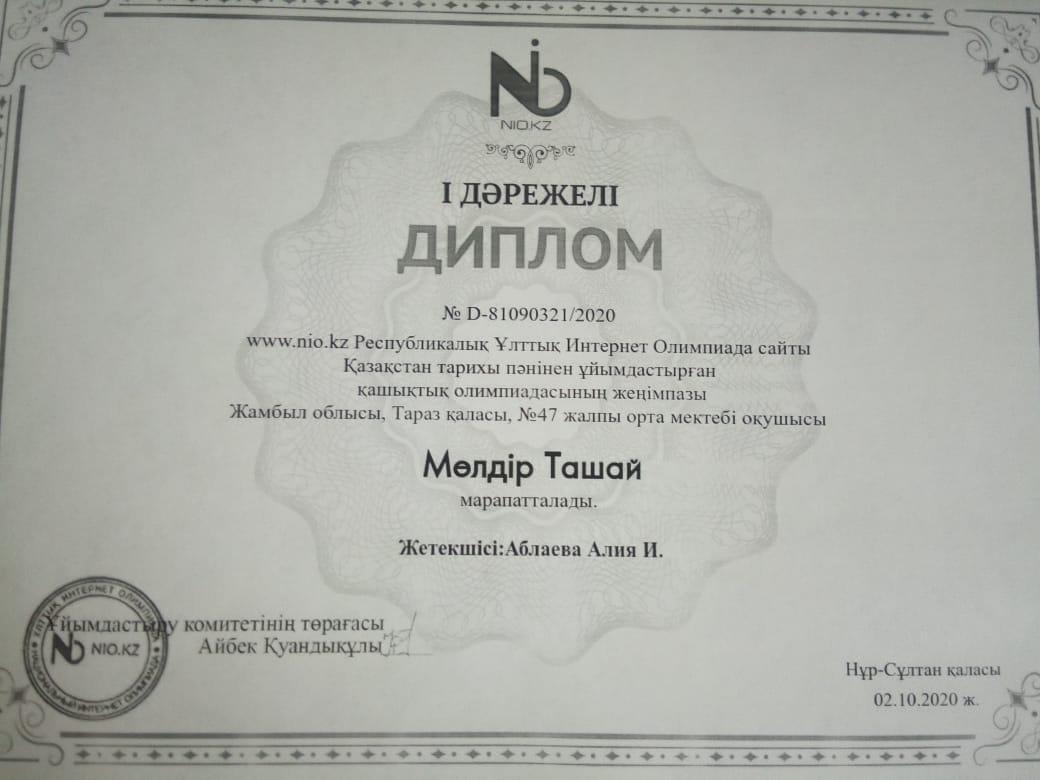 2020.02-05.10. күндері nio kz Республикалық Ұлттық Интернет Олимпиада сайты қазақстан тарихы пəнінен ұйымдастырған қашықтық олимпиадаға Тараз қаласы 47орта мектебінің оқушысы Мөлдір Пашай қатысып,1орынмен,Рамазан Аманғали қатысып, 2 дəрежелі дипломмен марапатталды.Жетекшісі Аблаева Алия.