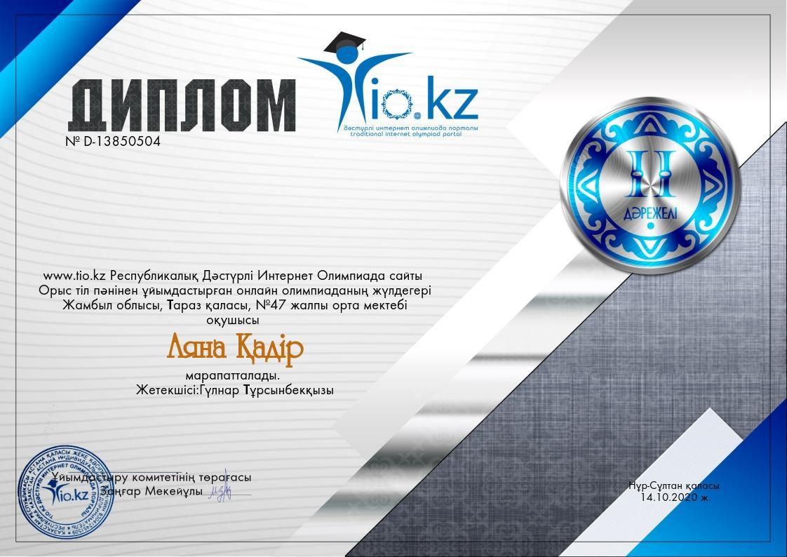 СШ №47 » Оқушыларға » Оқушылар жетістіктері » 4-15.10.2020 жылы nio kz Республикалық Ұлттық Интернет Олимпиада сайты орыс тілі пəнінен ұйымдастырған қашықтық олимпиадаға Тараз қаласы 47орта мектебінің оқушысы Лида Айдынқызы,Ляна Қадір дипломмен марапатталды.Жетекшісі Тұрсынбекқызы Гүл