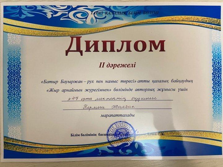 Бауыржан Момышұлының 110 жылдық мерейтойына орай Қалалық білім бөлімінің ұйымдастыруымен өткен байқаудың “Жыр арнаймын жүрегіммен” бөліміне 47 орта мектебінің 7”ә” сынып оқушысы Пермеш Жалғас қатысып, 2 дәрежелі дипломмен марапатталды. Жетекшісі :Досжанова Рахия Каюмовна