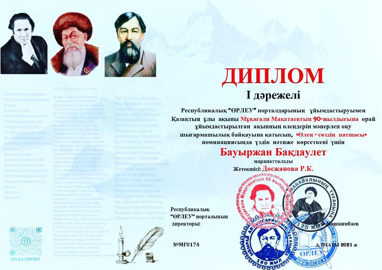 Тараз қаласы №47 орта мектебінің ерекше білім беретін арнайы сынып оқушысы Бауыржан Бақдаулет Республикалық “Өрлеу”порталының ұйымдастыруымен қазақтың ұлы ақыны М.Мақатаевтың 90 жылдығына орай ұйымдастырылған “Өлең -сөздің патшасы” номинациясында