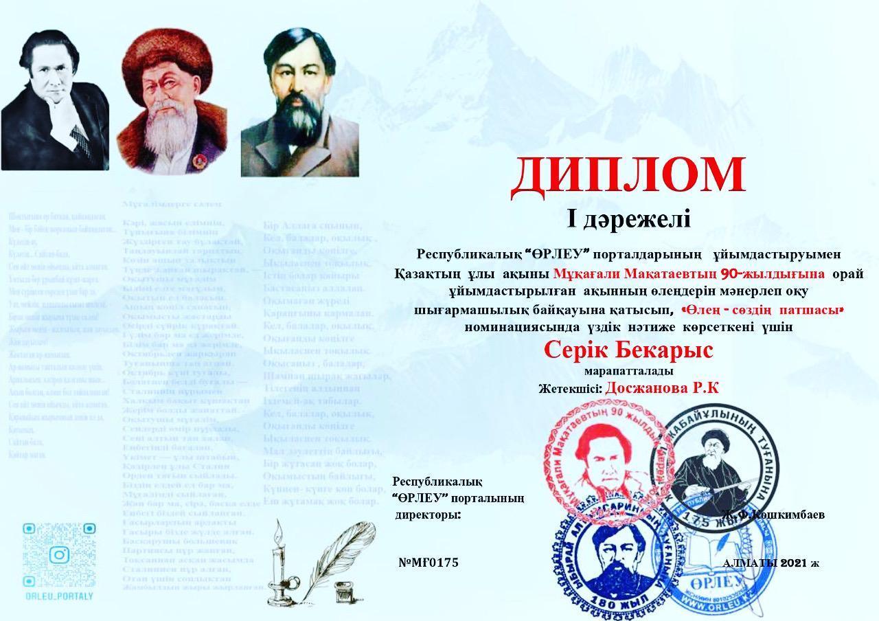 90 жылдығына орай ұйымдастырылған “Өлең-сөздің патшасы” номинациясында үздік нәтиже көрсетіп, 1 дәрежелі дипломмен марапатталды.