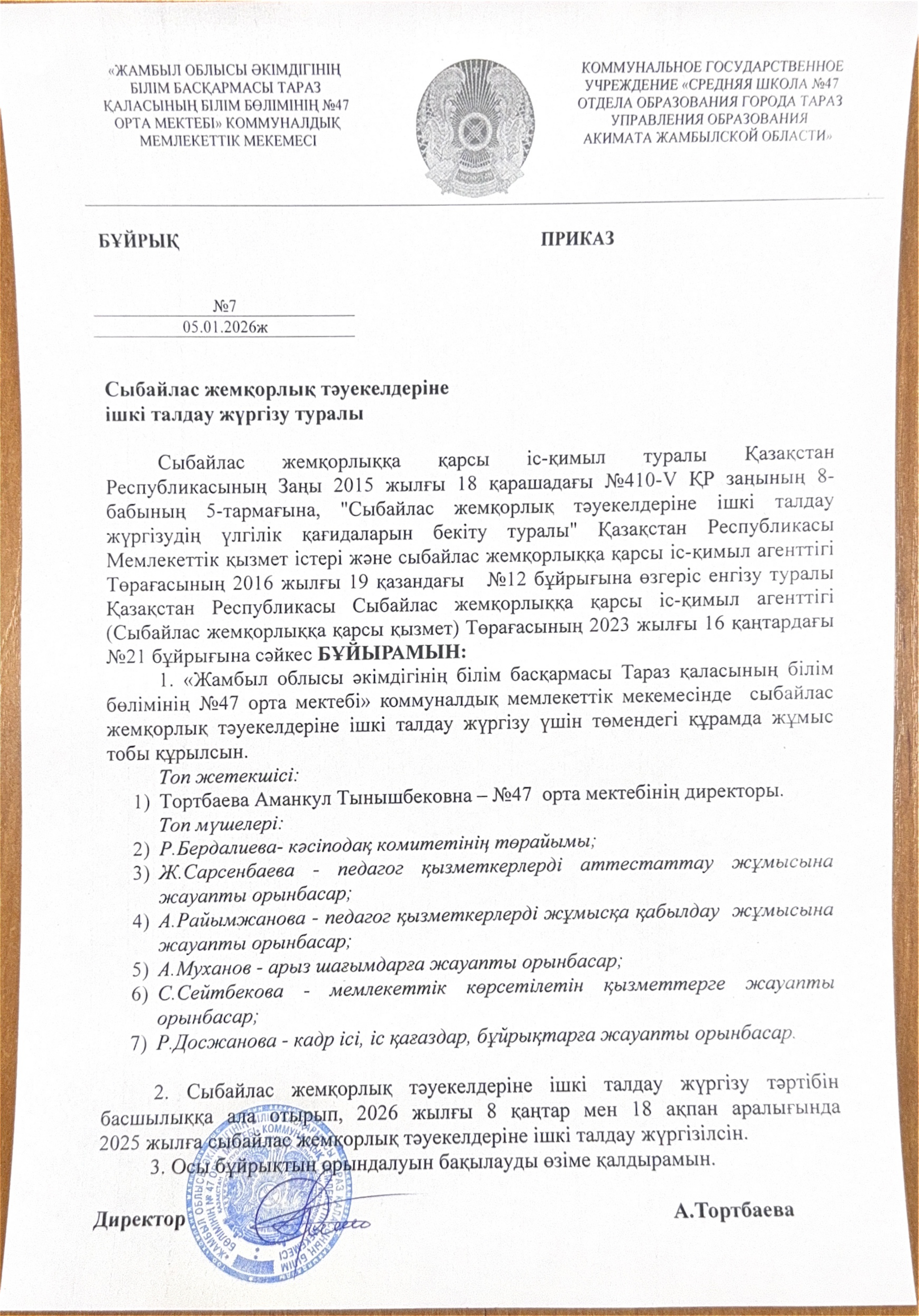 Сыбайлас жемқорлық тәуекелдеріне ішкі талдау жүргізу туралы бұйрық » СШ №47