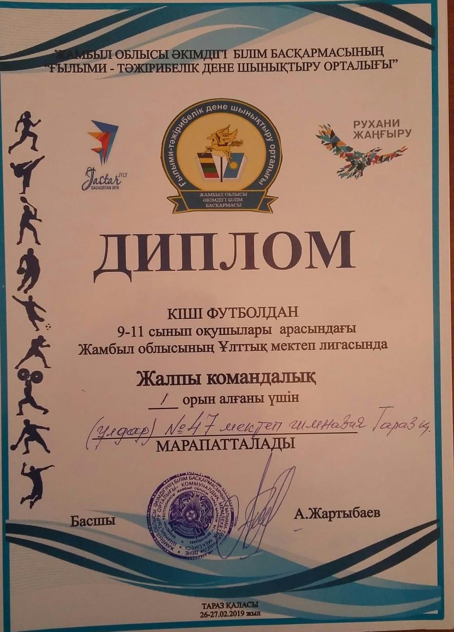 "Теңбіл доп" үйірмесі Жамбыл облысы Ұлттық мектеп лигасында Кіші футболдан 1 орын иеленіп Петропавл қаласында өтетін Республикалық жолдама ұтып алды. Жетекшілері Мырзахметов Медет Искаков Нажмидин » СШ №47