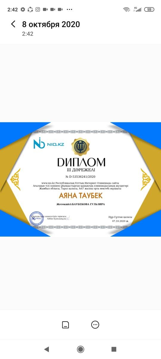 07.10.2020 жылы Республикалық Ұлттық Интернет Олимпиада сайты ағылшын тілі пəнінен ұйымдастырған қашықтық олимпиадаға Тараз қаласы 47орта мектебінің оқушысы Аяна Таубек қатысып, 3 дəрежелі дипломмен марапатталды.Жетекшісі Баубекова Г. » СШ №47