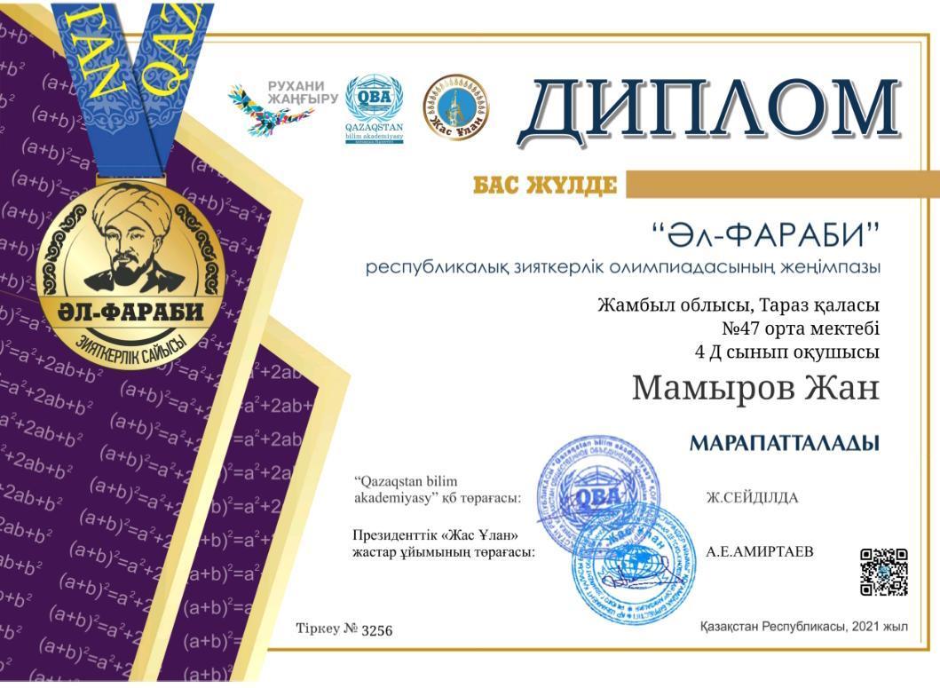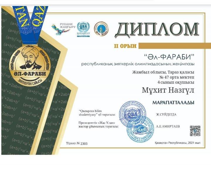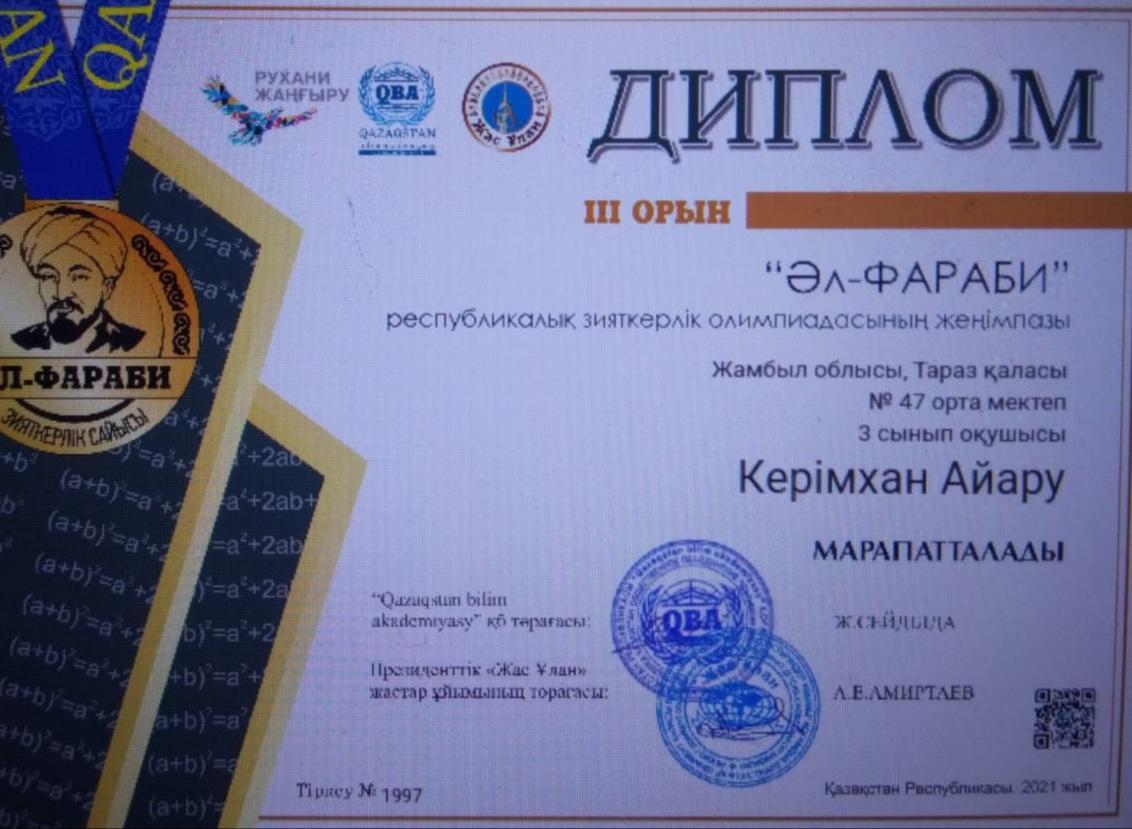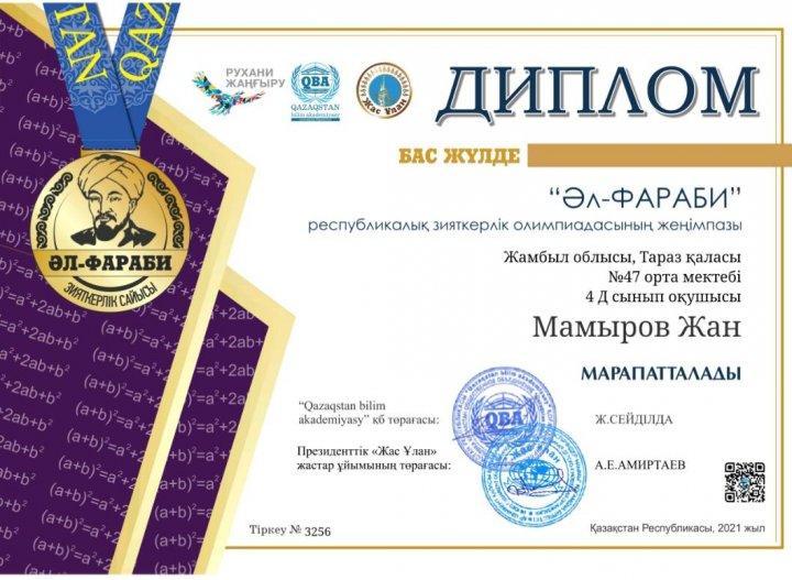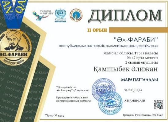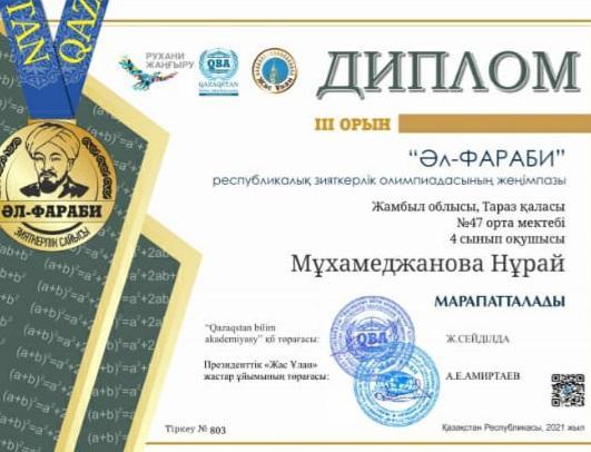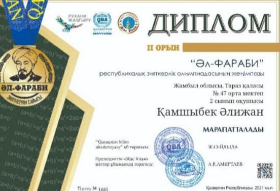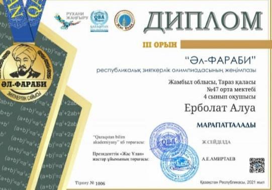 2-11 сынып оқушылары арасында өткізілген "Әл-Фараби"Республикалық зияткерлік олимпиадасына математика пәнінен Тараз қаласы 47 орта мектебінің 2,3,4,5,6,7,8,9,10 сынып оқушылары қатысып,жүлделі l,ll ,lll орынды иеленіп,дипломмен марапатталды.4-сынып оқушысы Мамыров Жан бас жүлдемен марапатталды.
