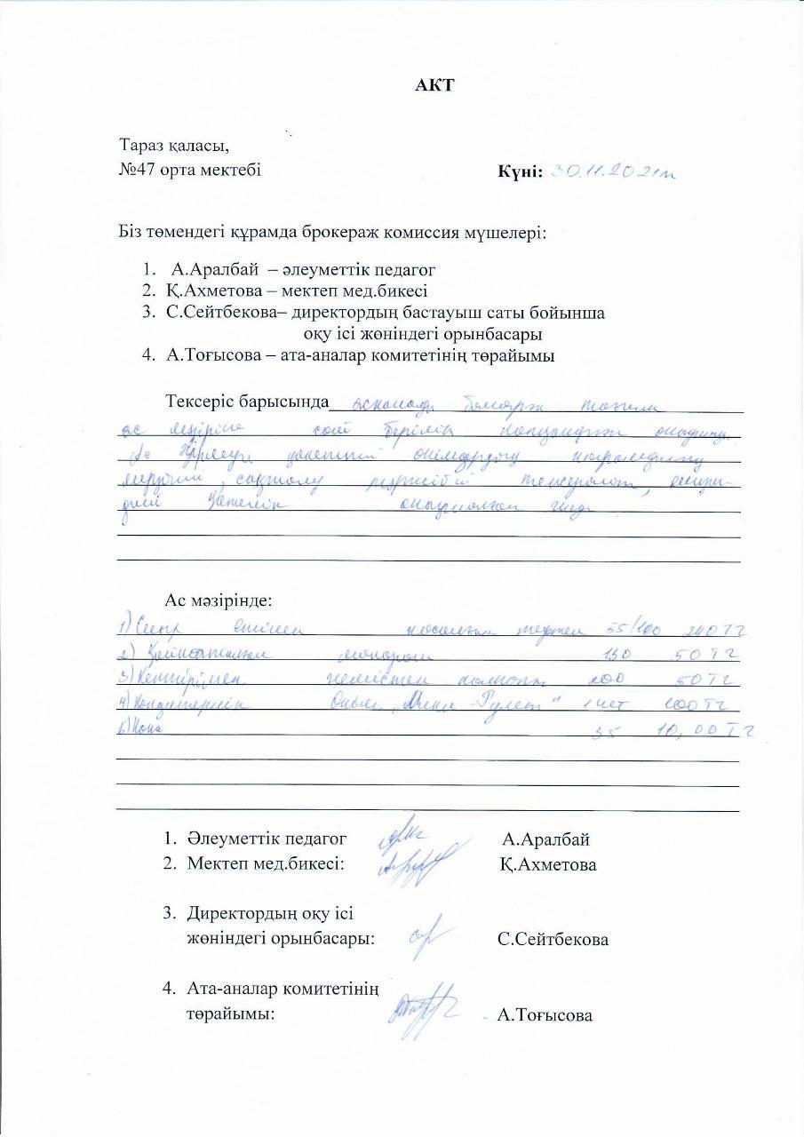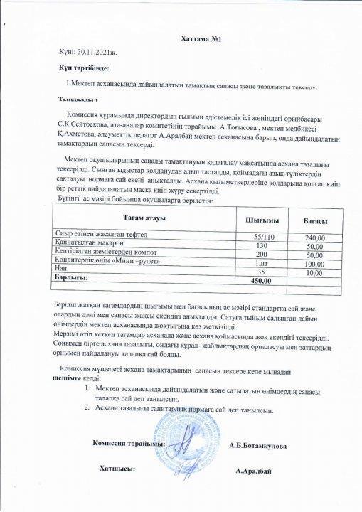 06 желтоқсан 2021 0 1 2 3 4 5 30.11.2021ж. Бракеражды комиссиясының Мектеп асханасында дайындалатын тамақтың сапасы және тазалықты тексеру жұмысы.